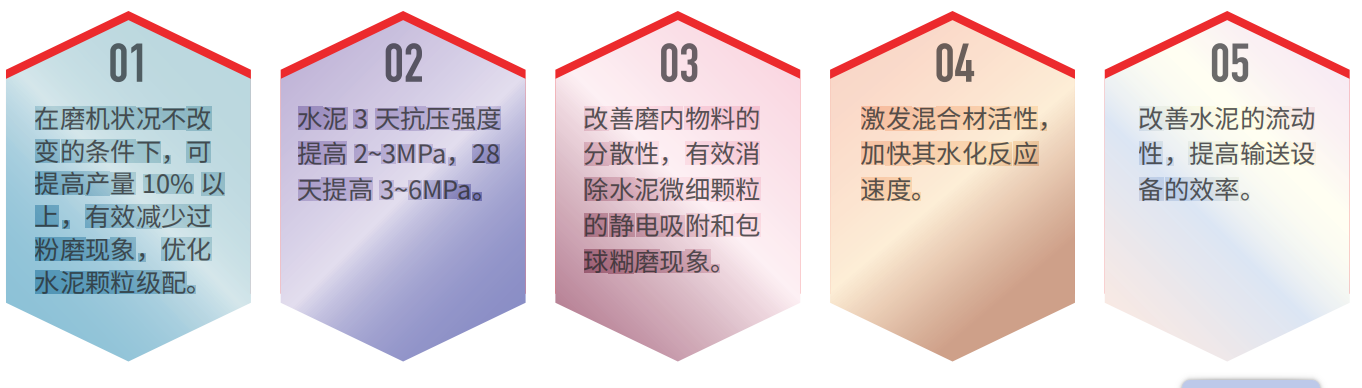 This product is suitable for various types of cement production enterprises. It can significantly improve the strength of ordinary cement, composite cement, slag cement, volcanic ash cement, especially high-dosage limestone cement. At the same time, according to customer needs, the cement setting time can be adjusted by adjusting the ratio of cement grinding aids, including extending and shortening the setting time.