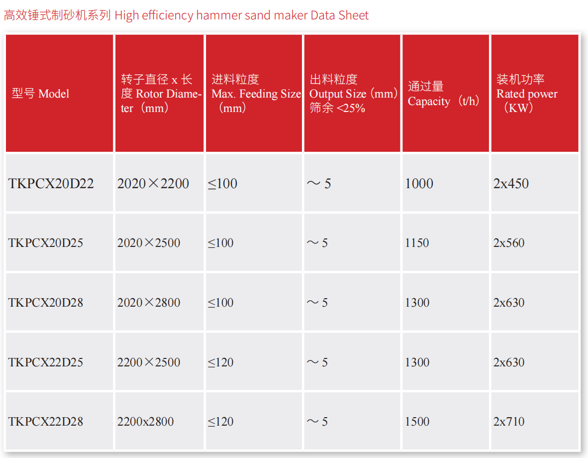 Home > Центр продукции > Шаровая мельница > Оборудование системы дробления Высокопроизводительная молотковая машина для производства пескаВысокопроизводительная машина для производства песка серии TKPCX — это крупногабаритная молотковая машина для производства песка, разработанная на основе многолетнего опыта в области молотковых дробилок. Она используется для мелкого дробления песка и гравийных заполнителей, песка машинного производства и т. д. Подходит для известняка с прочностью на сжатие менее 200 МПа.